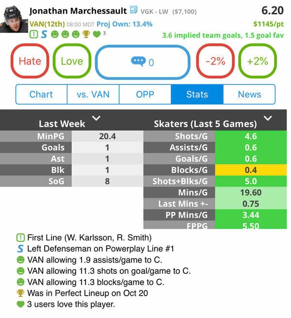 Should be well-owned going against a depleted Vancouver team tonight. If you want exposure to Vegas but don't want to ride with the crowd, you can certainly drop down to the Pacioretty line in tournaments.