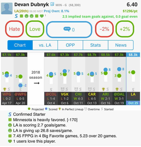 Devan Dubnyk, MIN (vs LA) (DK: $8.3K, FD: $8.6K)
