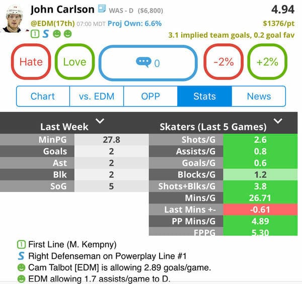 Late night D hammer. Edmonton is giving up 3.54 goals a game and Carlson is on that nasty top powerplay unit for Washington.