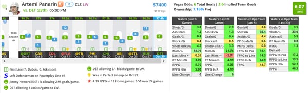 Jackets have been one of my favorite stacks this season and I love their matchup against Detroit tonight. I have a lot of interest in Atkinson as well but Panarin ranked a little higher in my model this morning.