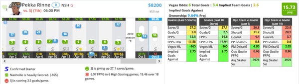 Rinne seems like the easy and safe move for tonight. San Jose is terrible. However, I don't think Rinne ends up being the highest scoring goalie on the slate, but I'm playing for the win equity in this one as Nashville should win.
