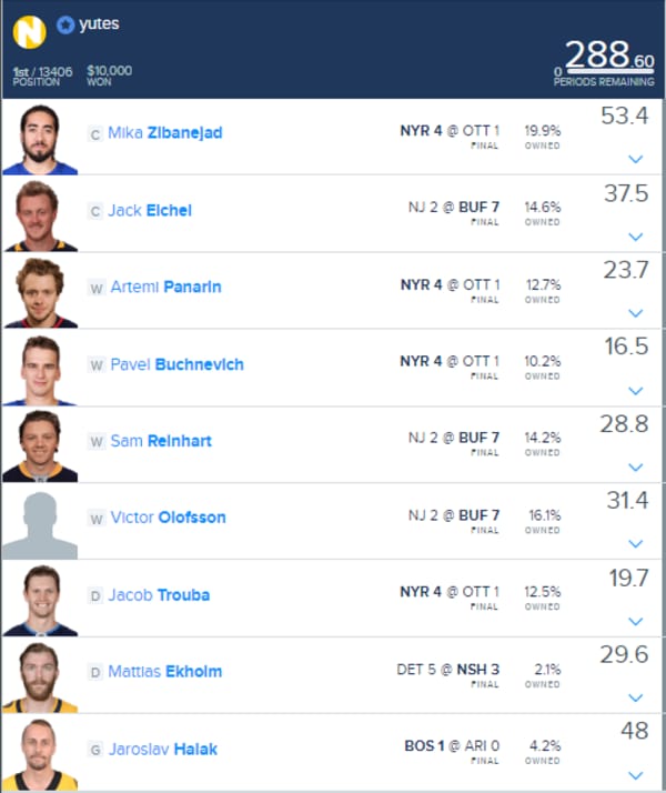 First, you'll see that Lamoosh2332 won the Saturday with a 4-3 stack of Buffalo and Montreal with a Draisaitl one-off. There was no correlation between the goalie and skaters in his lineup.