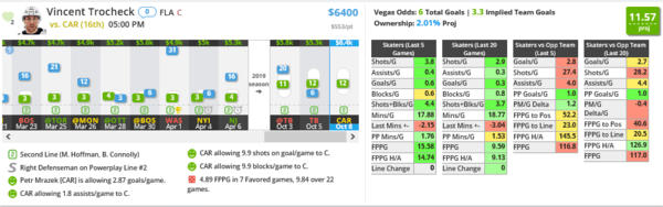 Trocheck is a better value on FD, but I love him tonight. I think he goes overlooked. The thing I love about him is he shoots the puck a lot and he's paired with Hoffman and Connolly, who are off to pretty good starts this season.