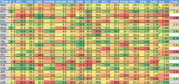 W = wins, L = losses (excluding OT losses), CF% = Corsi (shot attempts) For %, CF60 = Corsi for per 60 minutes, CA60 = Corsi allowed per 60 minutes, HDCF60 = High danger Corsi for per 60 minutes, HDCA60 = High danger Corsi allowed per 60 minutes, SF60 = shots for on net per 60 minutes, SA60 = shots on net allowed per 60 minutes, SV% = save percentage, SOT = shots on target (percentage of shots taken that hit the goal or go in), Sh% = shooting percentage (% of shots that become goals), SCF60 = scoring chances for per 60 minutes, SCA60 = scoring chances allowed per 60 minutes, PDO = Called SPSV% by the NHL, is the sum of a team's shooting percentage and its save percentage, GF60 = goals for per 60 minutes, GA60 = goals allowed per 60 minutes, Avg = Projected goals (my projections) for the team, xTotal = projected over/under