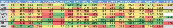W = wins, L = losses (excluding OT losses), CF% = Corsi (shot attempts) For %, CF60 = Corsi for per 60 minutes, CA60 = Corsi allowed per 60 minutes, HDCF60 = High danger Corsi for per 60 minutes, HDCA60 = High danger Corsi allowed per 60 minutes, SF60 = shots for on net per 60 minutes, SA60 = shots on net allowed per 60 minutes, SV% = save percentage, SOT = shots on target (percentage of shots taken that hit the goal or go in), Sh% = shooting percentage (% of shots that become goals), SCF60 = scoring chances for per 60 minutes, SCA60 = scoring chances allowed per 60 minutes, PDO = Called SPSV% by the NHL, is the sum of a team's shooting percentage and its save percentage, GF60 = goals for per 60 minutes, GA60 = goals allowed per 60 minutes, Avg = Projected goals (my projections) for the team, xTotal = projected over/under