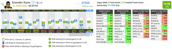 You might be wondering why Kane is here when I have Mike Smith as my top-ranked goalie a little bit above. Remember, my model is based around upside. Mike Smith could pull out a shutout, but in my mind, that's highly unlikely. Even if Smith only allows a couple of goals, I think Kane stands a good chance of being a part of that.