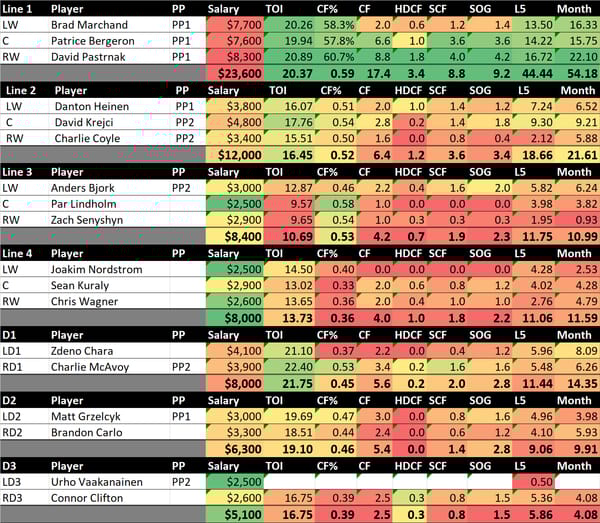 In the last issue, we talked about the Toronto chalk. Tonight, I'm expecting Boston to be the top-owned stack. So far this season, the top line for Boston has felt like Coors slates did for MLB. If you're only running a few lineups, I think it's hard not to play them. At the same time, I don't think the second line for Boston is a bad alternative. They're significantly cheaper, but this feels like stacking the 6-7-8 hitters at Coors. Maybe it works, but I think I'm going to lean on the top line. They share so much time together and their numbers are significantly higher than the other lines.