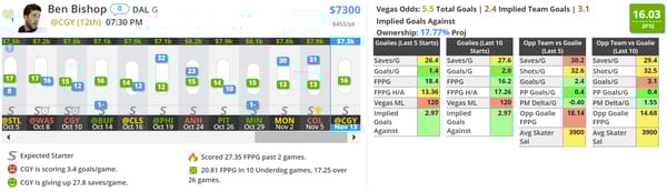 Bishop has been standing on his head lately, and I love his price on DraftKings tonight. "What's supposed to happen usually don't" but hard to not play a guy with a 1.88 GAA and .936 Save% over the past month.