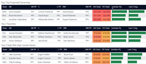 Line stacking is a common strategy in GPP. You’ll see a lot of winning lineups where players are stacked from the same forward lines or power play lines. DraftKings allows a maximum of 6 skaters from the same team (with skaters from at least 3 teams) and FanDuel allows a maximum of 4 skaters from one team. In tournaments, you'll often see 3-3 stacks (meaning 3 players from one team and 3 from another team), 4-3, and 3-3-2 stacks.
