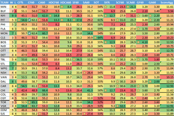 You'll notice I added a metric at the end called "ScoreAgg". This is the sum of a team's GF60, opposing GA60, and the xGF60 and opposing xGA60 from Natural Stat Trick. I've been testing this out as an indicator on teams to focus on (or avoid). Let me know if you find this helpful.
