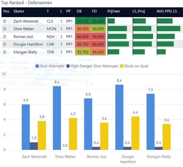 Montreal gives up a lot of shots, and a lot of shots to defensemen, which LineStar has highlighted on the player card. I wouldn't fault you for playing anyone else in my top 5, but I don't think you need to stretch your lineup to spend up for a Josi or Hamilton tonight.