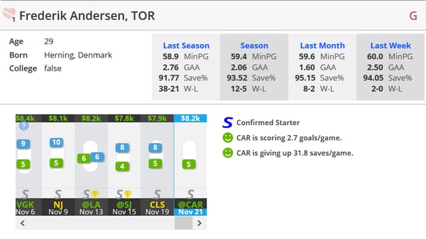 Frederik Andersen, TOR (vs CAR) (DK: $8.2K, FD: $8.9K)