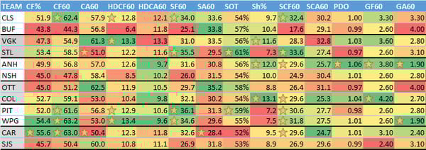 I mentioned this in chat, but I often use this to look for mismatches (teams that give up a lot of shots facing teams that take a lot of shots) and spots where both teams have sub 50% CF%. So if you're looking for "sneaky" stacks, that's where I start.
