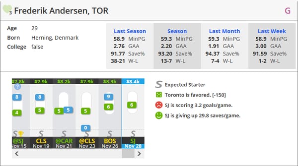 Ever since I put down Frederik Andersen (again), I've kept saying to myself that it won't age well. As I mentioned, I expect him to see decent shot volume. Because of this, I think it's worth playing the other side.