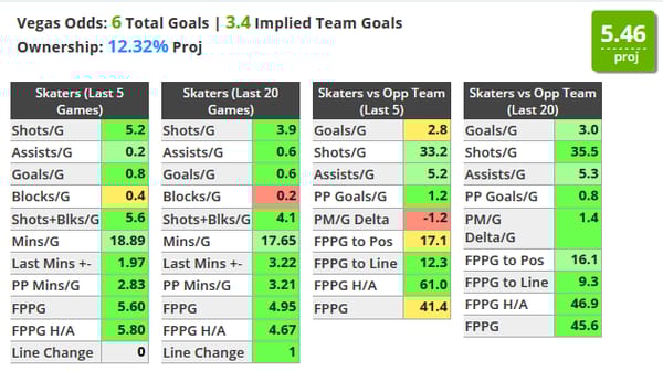 At his price, I can understand anyone that wants to fade him, but he's got some of the best numbers on the slate tonight. He's got a 65 CF% with 6.6 scoring chances, 8.8 shot attempts, 4.2 high danger, 5.2 shots on net, and a goal and assist per game over his last 5 games.