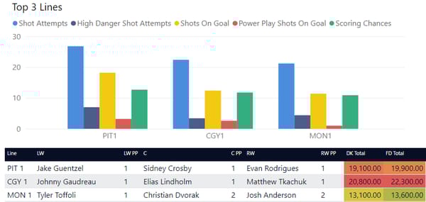 Line stacking is a common strategy in GPP. You’ll see a lot of winning lineups where players are stacked from the same forward lines or power play lines. DraftKings allows a maximum of 6 skaters from the same team (with skaters from at least 3 teams) and FanDuel allows a maximum of 4 skaters from one team. In tournaments, you'll often see 3-3 stacks (meaning 3 players from one team and 3 from another team), 4-3, and 3-3-2 stacks.