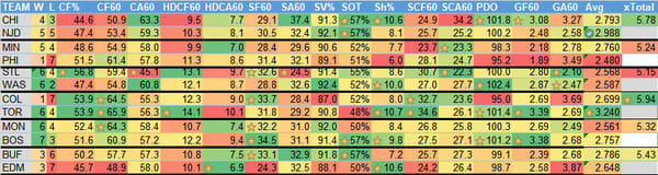 W = wins, L = losses (excluding OT losses), CF% = Corsi (shot attempts) For %, CF60 = Corsi for per 60 minutes, CA60 = Corsi allowed per 60 minutes, HDCF60 = High danger Corsi for per 60 minutes, HDCA60 = High danger Corsi allowed per 60 minutes, SF60 = shots for on net per 60 minutes, SA60 = shots on net allowed per 60 minutes, SV% = save percentage, SOT = shots on target (percentage of shots taken that hit the goal or go in), Sh% = shooting percentage (% of shots that become goals), SCF60 = scoring chances for per 60 minutes, SCA60 = scoring chances allowed per 60 minutes, PDO = Called SPSV% by the NHL, is the sum of a team's shooting percentage and its save percentage, GF60 = goals for per 60 minutes, GA60 = goals allowed per 60 minutes, Avg = Projected goals (my projections) for the team, xTotal = projected over/under