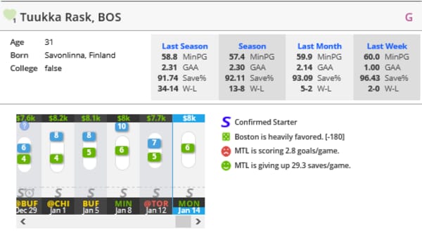Tuuka Rask (vs MON) (DK: $8K, FD: $9.1K)