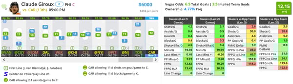 As always, I love to target players that have similar shot volume to that of more expensive players. On a slate like tonight, I think there's going to be a lot of the herd that is gravitating towards Matthews, Bergeron, or MacKinnon when Giroux has been quietly putting 4.2 shots on net over the last 5 games.