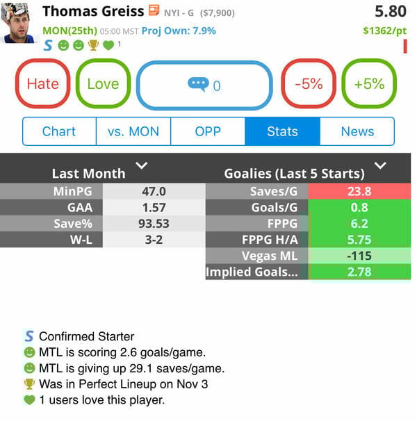Thomas Greiss, NYI (vs MON) (DK: $7.9K, FD: $7.5K)