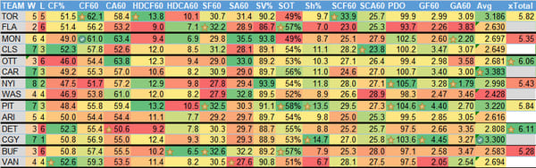 W = wins, L = losses (excluding OT losses), CF% = Corsi (shot attempts) For %, CF60 = Corsi for per 60 minutes, CA60 = Corsi allowed per 60 minutes, HDCF60 = High danger Corsi for per 60 minutes, HDCA60 = High danger Corsi allowed per 60 minutes, SF60 = shots for on net per 60 minutes, SA60 = shots on net allowed per 60 minutes, SV% = save percentage, SOT = shots on target (percentage of shots taken that hit the goal or go in), Sh% = shooting percentage (% of shots that become goals), SCF60 = scoring chances for per 60 minutes, SCA60 = scoring chances allowed per 60 minutes, PDO = Called SPSV% by the NHL, is the sum of a team's shooting percentage and its save percentage, GF60 = goals for per 60 minutes, GA60 = goals allowed per 60 minutes, Avg = Projected goals (my projections) for the team, xTotal = projected over/under