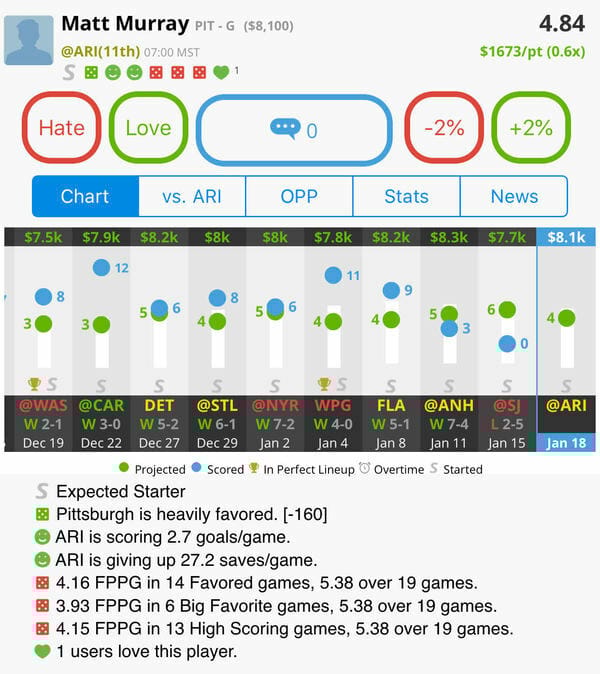 Matt Murray (vs PIT) (DK: $8.1K, FD: $8.8K)