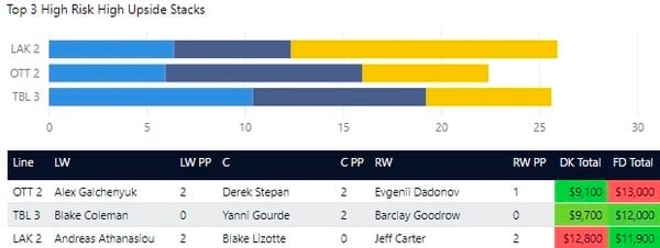 Line stacking is a common strategy in GPP. You’ll see a lot of winning lineups where players are stacked from the same forward lines or power play lines. DraftKings allows a maximum of 6 skaters from the same team (with skaters from at least 3 teams) and FanDuel allows a maximum of 4 skaters from one team. In tournaments, you'll often see 3-3 stacks (meaning 3 players from one team and 3 from another team), 4-3, and 3-3-2 stacks.