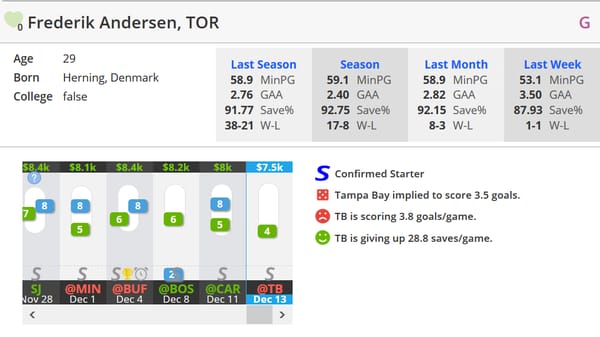 Hear me out on this. Andersen has been pretty solid over his last 10 games from a fantasy perspective (5.8 points on DraftKings over the last 5, 23.2 on FanDuel over the same period). Tampa is a difficult team to roster a goalie against, but there's a ton of upside if he can keep the puck out of the net as Tampa is averaging 33.6 shots a game over their last 10.
