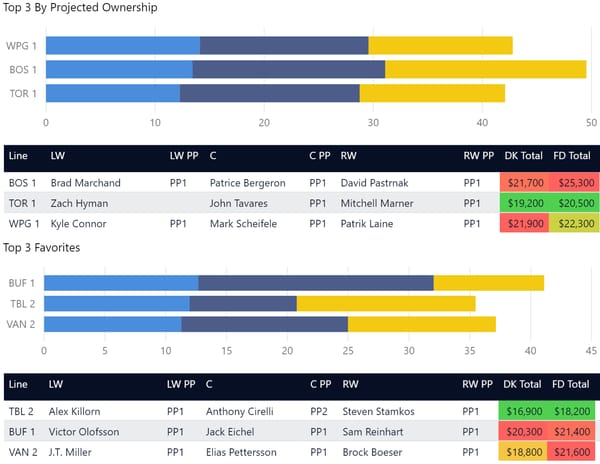 Line stacking is a common strategy in GPP. You’ll see a lot of winning lineups where players are stacked from the same forward lines or power play lines. DraftKings allows a maximum of 6 skaters from the same team (with skaters from at least 3 teams) and FanDuel allows a maximum of 4 skaters from one team. In tournaments, you'll often see 3-3 stacks (meaning 3 players from one team and 3 from another team), 4-3, and 3-3-2 stacks.