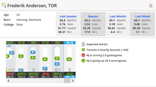 Frederik Andersen (@ NJ) (DK: $8.1K, FD: $9.1K)