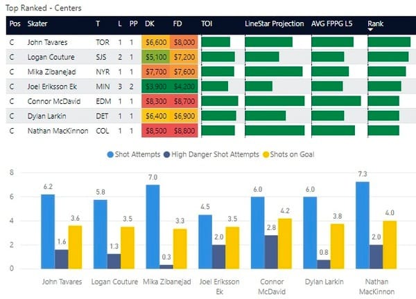 If you take anything away from this, keep in mind that hockey is a high-variance sport. The top ranked player in each category could be a great play or be a dud tonight. Going all in on any player probably isn't a great move.