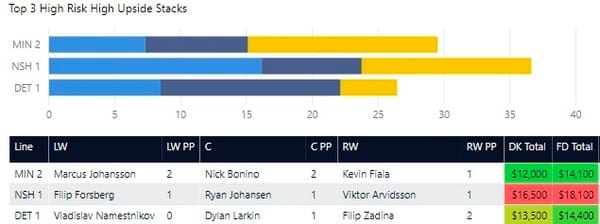 Line stacking is a common strategy in GPP. You’ll see a lot of winning lineups where players are stacked from the same forward lines or power play lines. DraftKings allows a maximum of 6 skaters from the same team (with skaters from at least 3 teams) and FanDuel allows a maximum of 4 skaters from one team. In tournaments, you'll often see 3-3 stacks (meaning 3 players from one team and 3 from another team), 4-3, and 3-3-2 stacks.