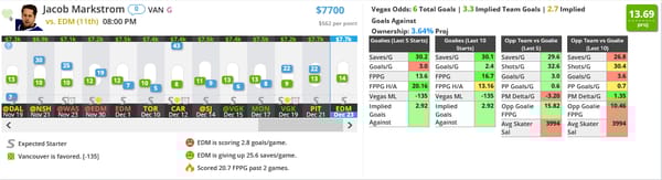 I don't love Markstrom as much as I have in the past, but I like him a lot tonight for the price. Edmonton is always risky, but I want to spend up on my skaters tonight, so I'm willing to take the risk.