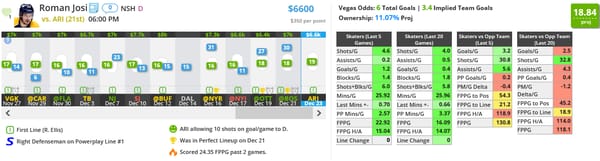 Josi is the best option tonight if you're going to spend up at D. Not only does he have a solid shot volume, but he's been trending up in shots on goal over the last 5 games vs the last 20 games.