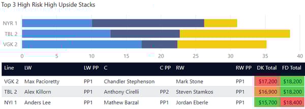 Line stacking is a common strategy in GPP. You’ll see a lot of winning lineups where players are stacked from the same forward lines or power play lines. DraftKings allows a maximum of 6 skaters from the same team (with skaters from at least 3 teams) and FanDuel allows a maximum of 4 skaters from one team. In tournaments, you'll often see 3-3 stacks (meaning 3 players from one team and 3 from another team), 4-3, and 3-3-2 stacks.