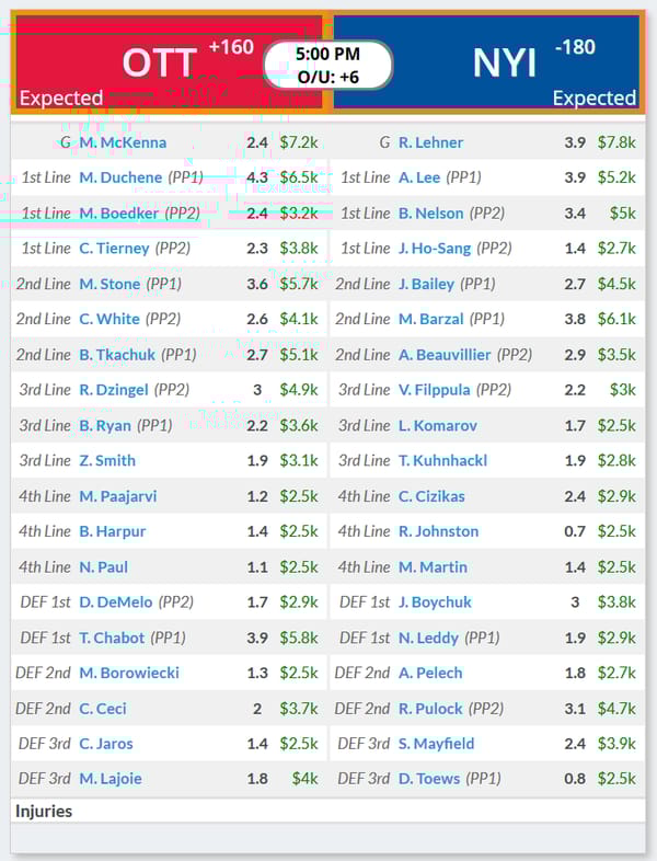 OTT: Tkachuk-White-Stone (DK: $14.8K, FD: $15.9K)
