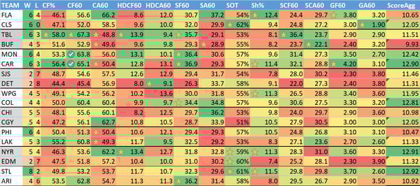 ScoreAgg: Summed numbers of a teams GF60, xGF60 and the opponent's GA60 and xGA60.