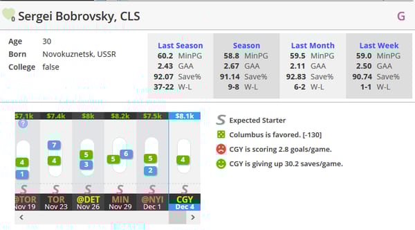 Sergei Bobrovsky, CLS (vs CGY) (DK: $8.1K, FD: $8.8K)