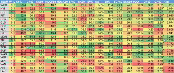 You'll note that I added an "Avg" column to the slate graphic. That's basically my expected goals from each time by the slate. It's a combination of what teams have been scoring and allowing along with my secret sauce to get a number of goals that I expect to see from each game today. It's far from perfect, but I've found it useful.