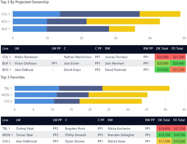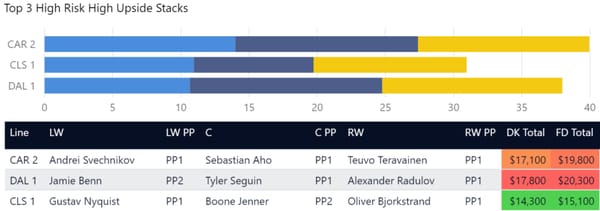 Line stacking is a common strategy in GPP. You’ll see a lot of winning lineups where players are stacked from the same forward lines or power play lines. DraftKings allows a maximum of 6 skaters from the same team (with skaters from at least 3 teams) and FanDuel allows a maximum of 4 skaters from one team. In tournaments, you'll often see 3-3 stacks (meaning 3 players from one team and 3 from another team), 4-3, and 3-3-2 stacks.
