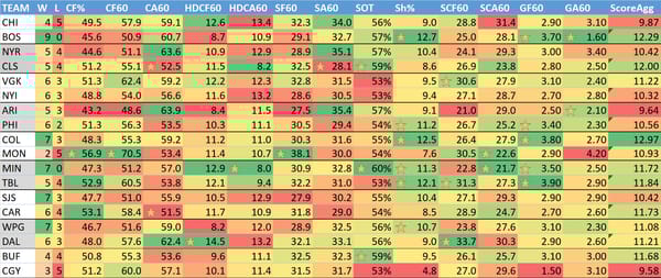 You'll notice I added a metric at the end called "ScoreAgg." This is the sum of a team's GF60, opposing GA60, and the xGF60 and opposing xGA60 from Natural Stat Trick. I've been testing this out as an indicator on teams to focus on (or avoid). Let me know if you find this helpful.