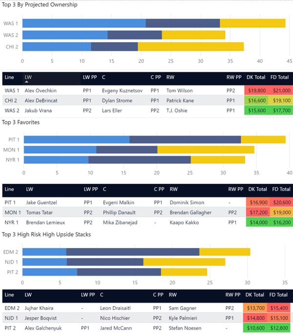 Line stacking is a common strategy in GPP. You’ll see a lot of winning lineups where players are stacked from the same forward lines or power play lines. DraftKings allows a maximum of 6 skaters from the same team (with skaters from at least 3 teams) and FanDuel allows a maximum of 4 skaters from one team. In tournaments, you'll often see 3-3 stacks (meaning 3 players from one team and 3 from another team), 4-3, and 3-3-2 stacks.