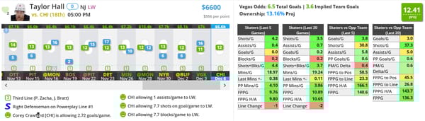 I really like Hall here more as a one-off than in a stack. He's still one of the most talented players in the league and gets a good matchup against a Chicago team that has been giving up 3.8 goals over their last 5 games.