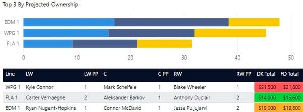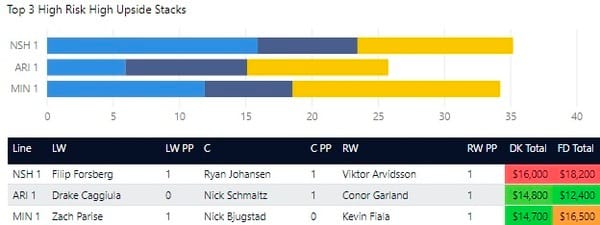 Line stacking is a common strategy in GPP. You’ll see a lot of winning lineups where players are stacked from the same forward lines or power play lines. DraftKings allows a maximum of 6 skaters from the same team (with skaters from at least 3 teams) and FanDuel allows a maximum of 4 skaters from one team. In tournaments, you'll often see 3-3 stacks (meaning 3 players from one team and 3 from another team), 4-3, and 3-3-2 stacks.