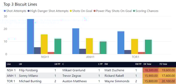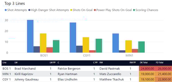 Line stacking is a common strategy in GPP. You’ll see a lot of winning lineups where players are stacked from the same forward lines or power play lines. DraftKings allows a maximum of 6 skaters from the same team (with skaters from at least 3 teams) and FanDuel allows a maximum of 4 skaters from one team. In tournaments, you'll often see 3-3 stacks (meaning 3 players from one team and 3 from another team), 4-3, and 3-3-2 stacks.