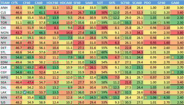 I mentioned this in chat, but I often use this to look for mismatches (teams that give up a lot of shots facing teams that take a lot of shots) and spots where both teams have sub 50% CF%. So if you're looking for "sneaky" stacks, that's where I start.