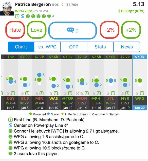 Patrice Bergeron: BOS - C (DK: $7.7K, FD: $8.4K)