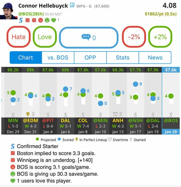 Connor Hellebuyck, WPG (@ BOS) (DK: $7.6K, FD: $8.5K)