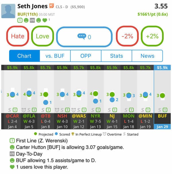 Seth Jones: CLS - D (DK: $5.9K, FD: $5.7K)