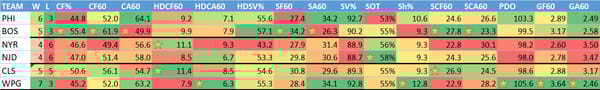 W = wins, L = losses (excluding OT losses), CF% = Corsi (shot attempts) For %, CF60 = Corsi for per 60 minutes, CA60 = Corsi allowed per 60 minutes, HDCF60 = High danger Corsi for per 60 minutes, HDCA60 = High danger Corsi allowed per 60 minutes, SF60 = shots for on net per 60 minutes, SA60 = shots on net allowed per 60 minutes, SV% = save percentage, SOT = shots on target (percentage of shots taken that hit the goal or go in), Sh% = shooting percentage (% of shots that become goals), SCF60 = scoring chances for per 60 minutes, SCA60 = scoring chances allowed per 60 minutes, PDO = Called SPSV% by the NHL, is the sum of a team's shooting percentage and its save percentage, GF60 = goals for per 60 minutes, GA60 = goals allowed per 60 minutes.